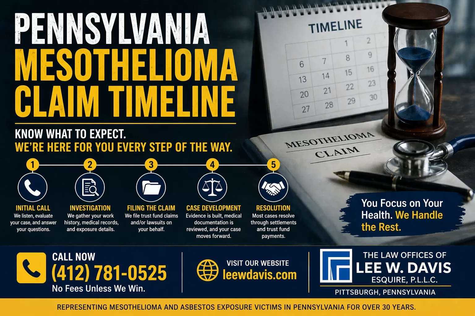 This page addresses the Pennsylvania mesothelioma claim timeline specifically and honestly — what the realistic calendar looks like at each phase of the claim, what factors accelerate or extend the timeline, and what a seriously ill Pennsylvania mesothelioma patient can do to move the process forward when time is genuinely short.