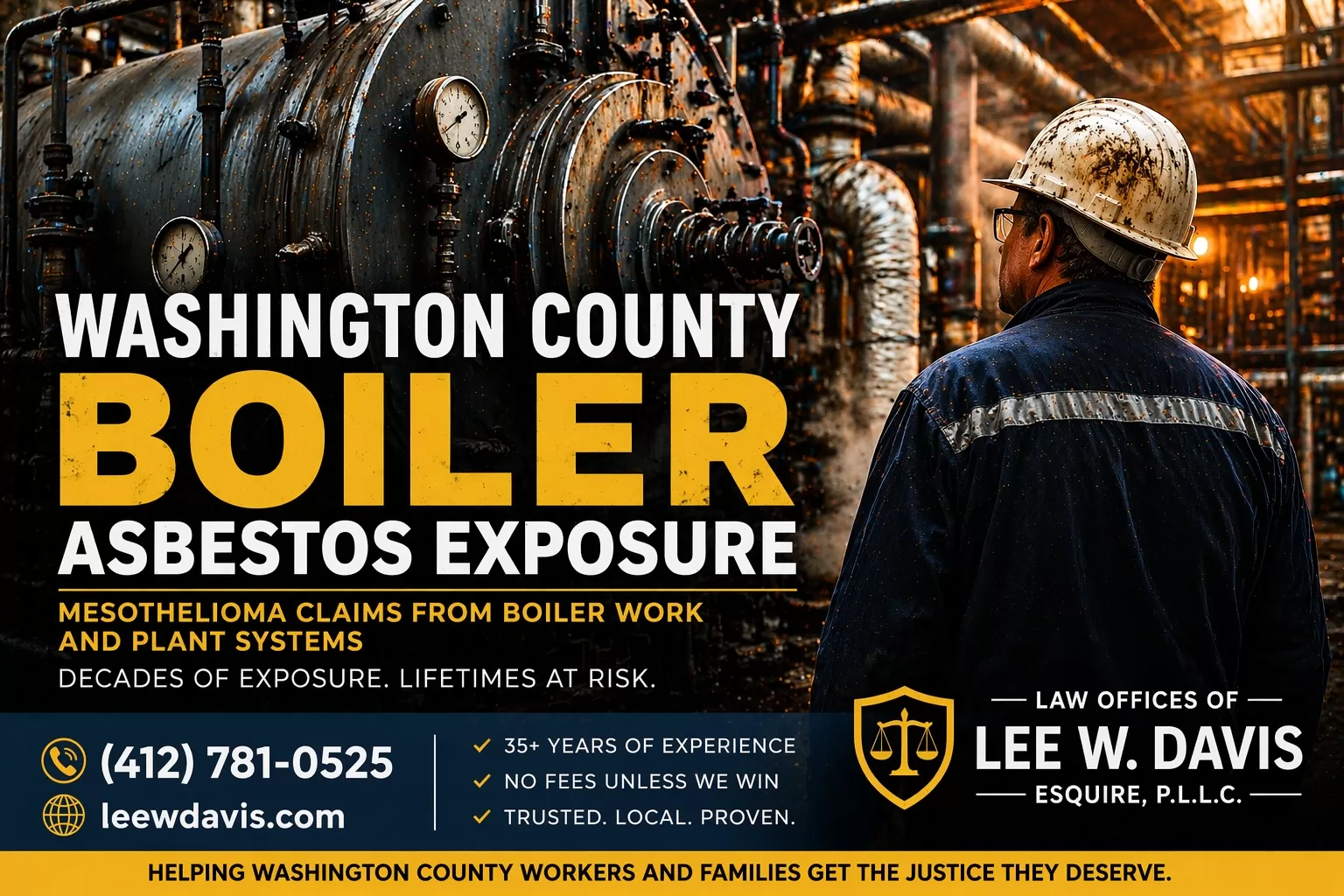 If you worked on boiler systems at a Washington County industrial facility and you’ve been diagnosed with mesothelioma or lung cancer, Washington County boiler asbestos exposure is a well-documented occupational history that has supported successful claims for workers and their families throughout this region of western Pennsylvania. Washington County’s steel facilities, manufacturing plants, coal operations, and the powerhouses and industrial steam systems that served them all relied on boiler systems insulated with asbestos-containing materials throughout their operational lives — and the workers who built, operated, maintained, and rebuilt those systems accumulated asbestos exposure that continues to produce mesothelioma and lung cancer diagnoses today.